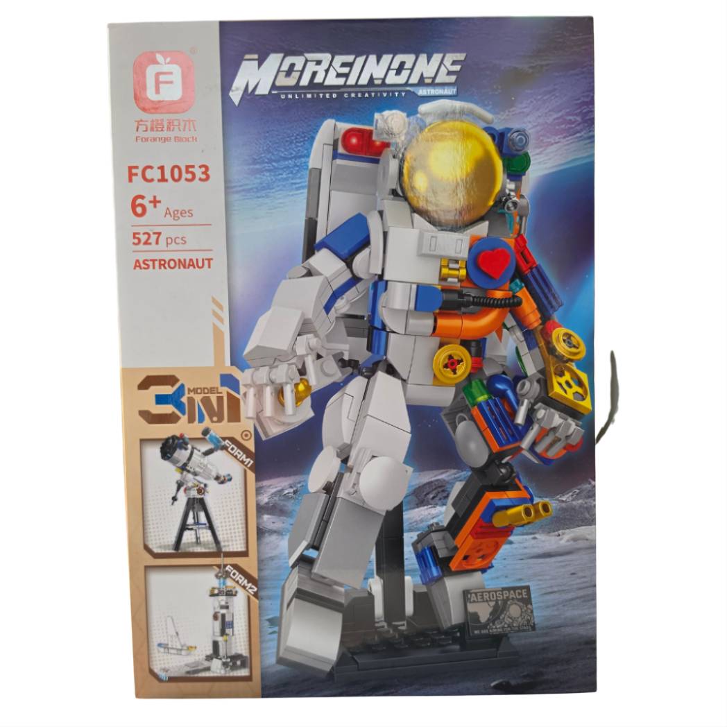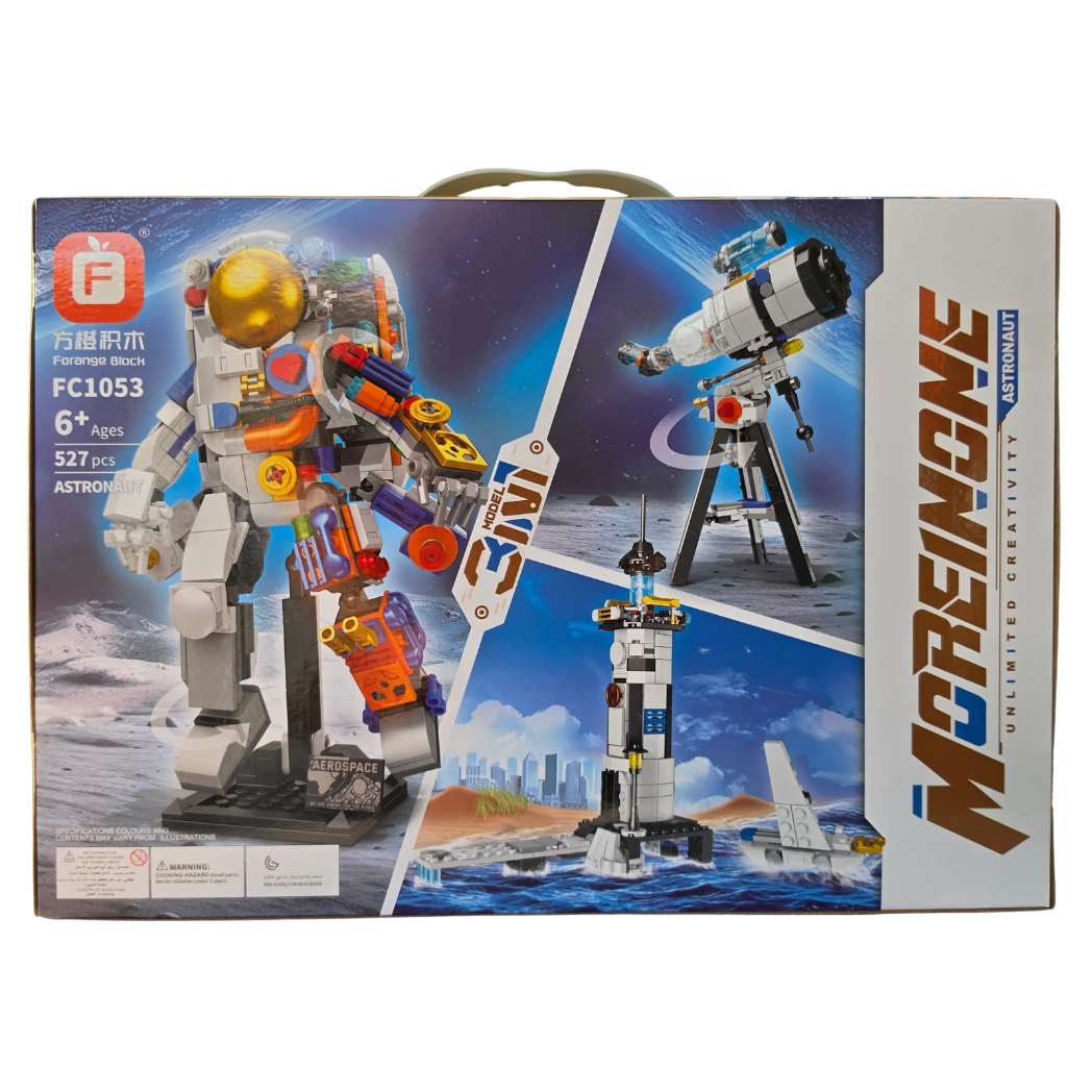 Armable con varias opciones de armado, se puede armar como astronauta, telescopio o base espacial. Tiene 527 piezas.