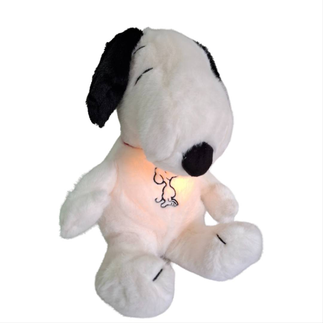 Peluche de snoopy que respira. Tiene luz y música. Usa 3 baterías AAA incluídas al detal. 26cm de Altura.